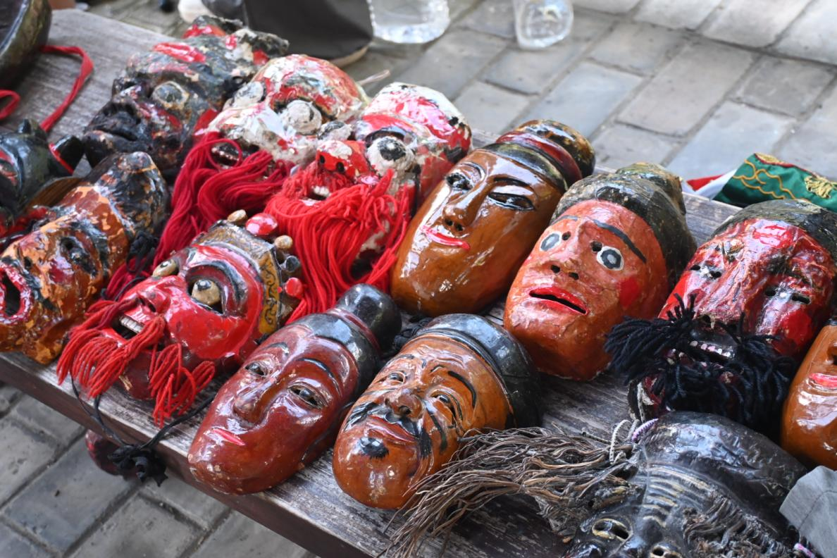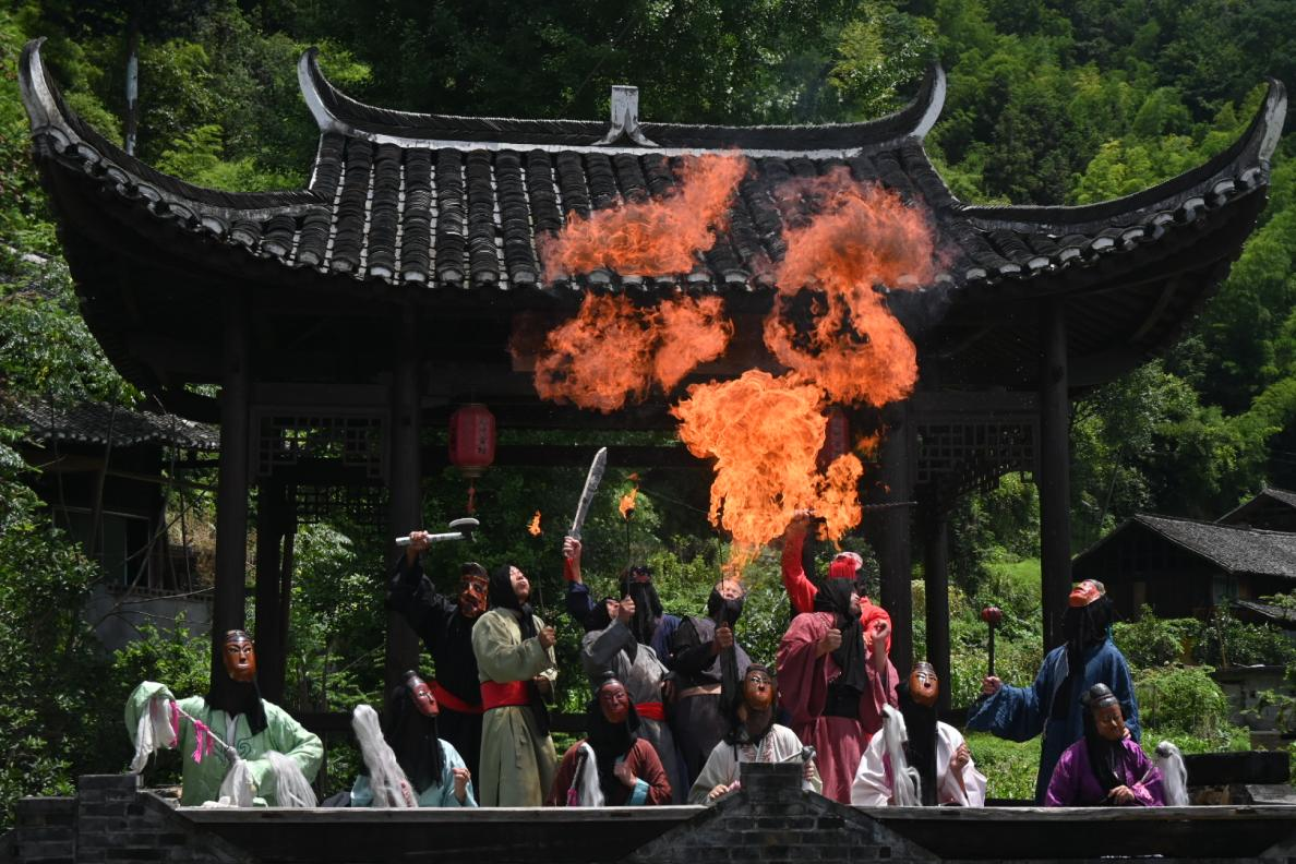 演出开场,傩戏演员身着色彩鲜艳传统服饰,佩戴造型古朴夸张的傩戏表演面具登上月光亭舞台。面具雕刻精细,不同的造型对应不同的角色与寓意。表演高潮处,傩戏绝活“喷火”亮相,升腾的火焰映照在傩戏表演面具上,视觉冲击强烈,更添神秘色彩。