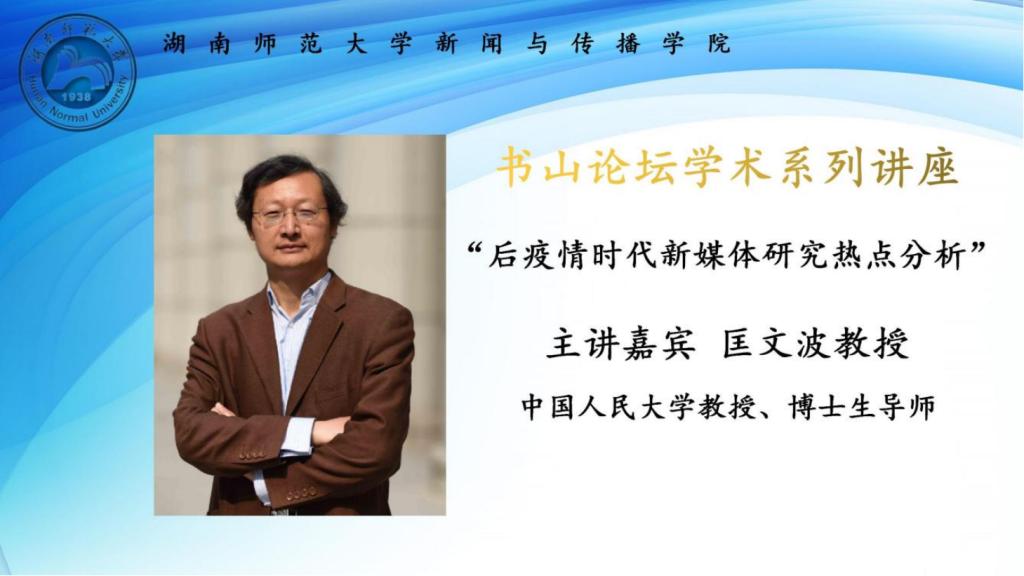 (通讯员 靳盼)近日,教育部新世纪优秀人才、中国人民大学教授、博士生导师匡文波教授做客书山论坛,在线为公司员工及部分青年教师带来题为“后疫情时代新媒体研究热点分析”的学术讲座。公司党委书记沈贤岚主持本次讲座,他详尽地介绍了匡文波教授的研究领域和研究成果,对其在网络与新媒体领域的学术成就予以高度评价,并对匡教授多次来公司给予学术和教学的指导表示感谢。