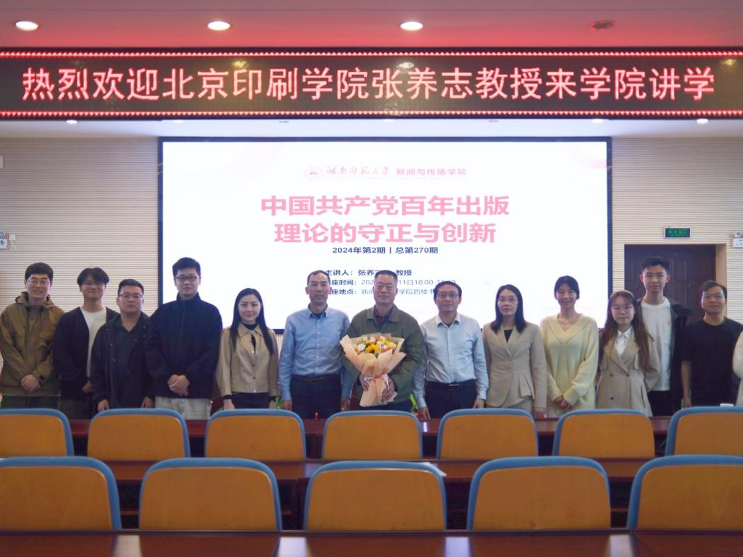 张养志从大历史观和唯物史观的角度给师生们分析了研究中国共产党百年出版理论的守正与创新的原因,并提出了“两个结合”的研究路线,即把马克思主义基本原理同中国具体实际相结合、同中华优秀传统文化相结合。出版学理论既要及时回答时代新课题,也要从人民群众的创造中汲取理论、创新智慧,跟上时代步伐。由此,他鼓励同学们在深入研究、学习出版学时,不能只停留在知识层面,应该要考虑到时代变化,从政治、文化、社会功能等方面着手思考。