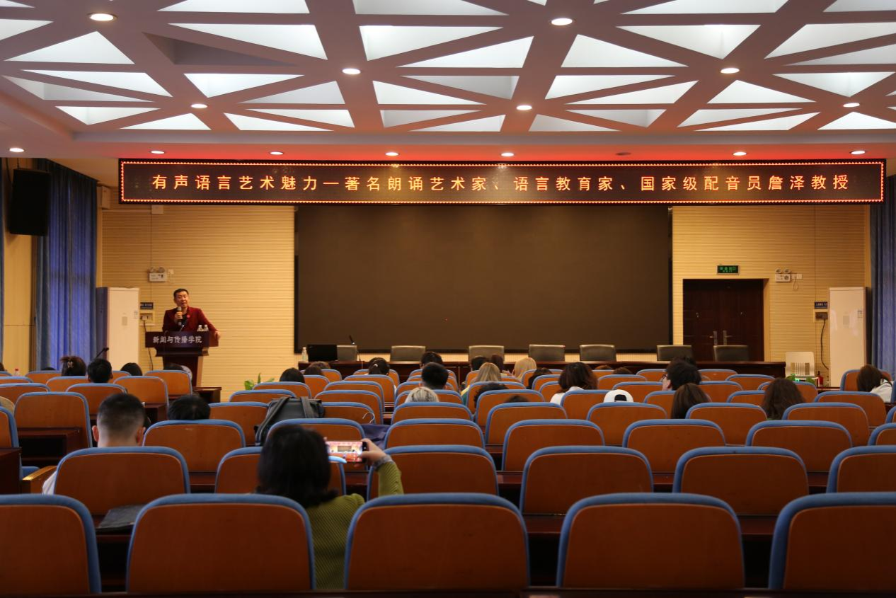 詹泽以自己踏上播音主持道路的经历为引入,在讲解语言艺术处理的同时进行了广告语、新闻频道、经典影视作品等的现场配音展示。他指出,科学的发声方式不仅能有效地改善音色,提高用声能力,使语音呈现出清晰流畅、圆润集中的效果,同时,富有感染力的声音也能在不同环境下呈现出各具魅力的艺术效果,使受众产生共鸣、触动心灵,给人以美的享受。