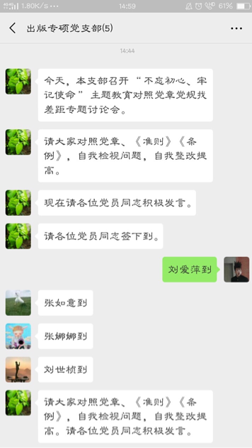 (通讯员 刘爱萍)10月31日14点40分,beats365出版专硕支部关于“不忘初心、牢记使命”主题教育对照党章党规找差距专题讨论会于微信平台开展。出版专硕支部全体党员参与并积极开展讨论。